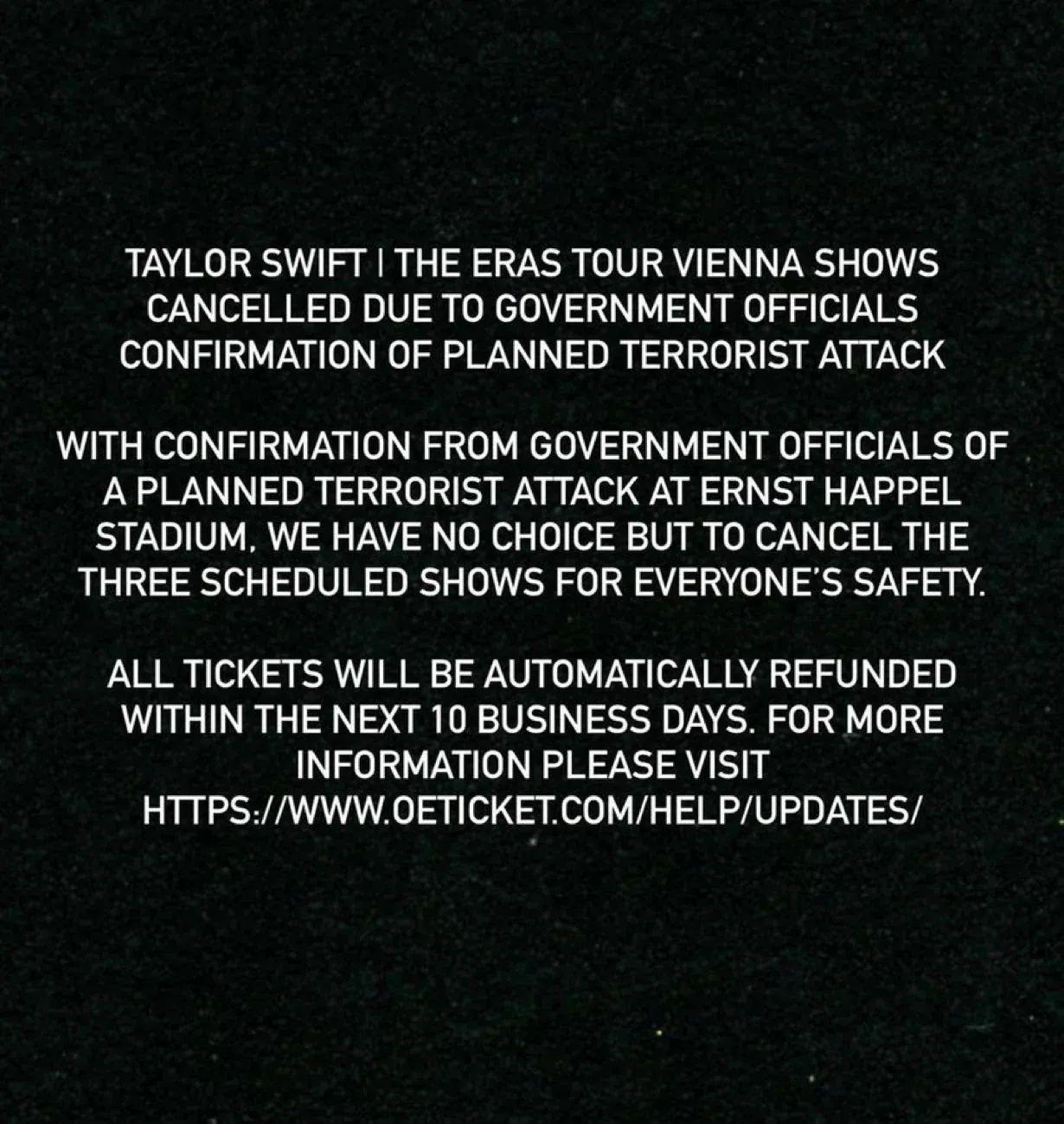 All shows in Vienna cancelled I read. Well this is not great. I searched on Google News for details and saw a bunch of articles explaining how there was a terrorist plot that was thwarted in Vienna, planning to attack the stadium. All the articles said that the show would proceed as normal, that there would be extra security measures so please arrive early. I concluded that the Swift Alert app was incorrect. Then I got a bunch of WhatsApps from my friends, both the Swifties and the non-Swifties-but-supportive-of-my-hobby (everyone say "Hi Matteo", he is a great friend and very supportive of the adventure of mine, always checking in which city I've been in) with links to more news articles.
