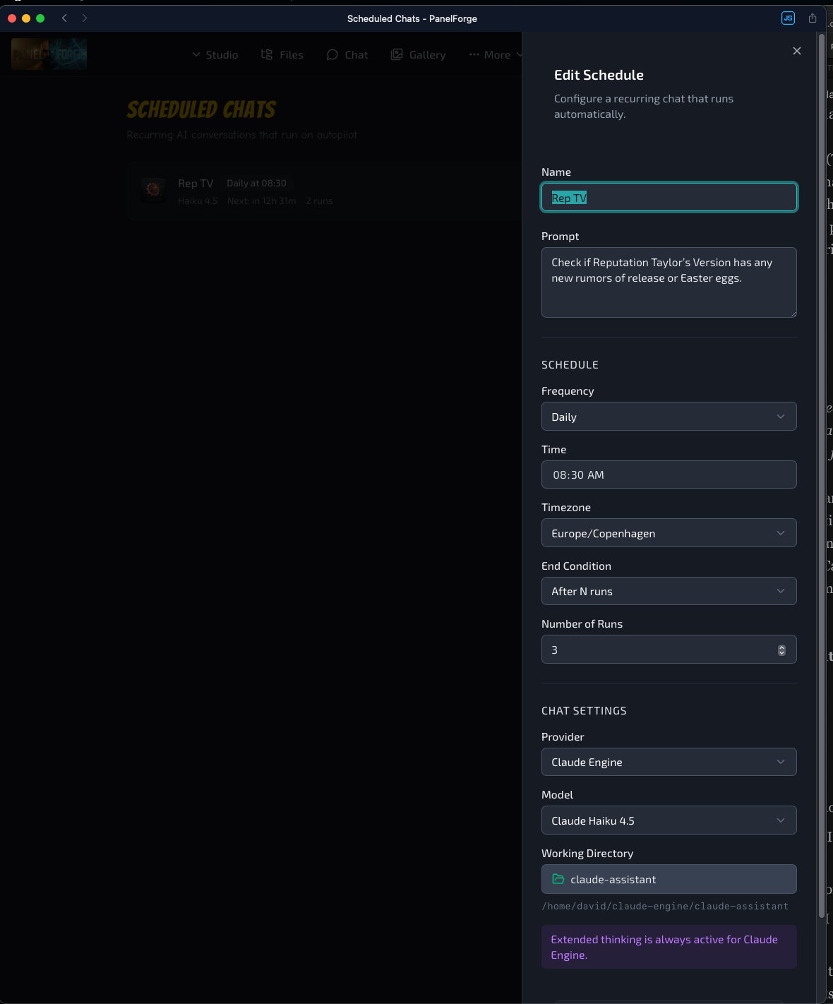 PanelForge checks for Taylor Swift Reputation (Taylor's Version) news. How delusional, I know, she already bought all her masters back and said that she isn't re-recording that one but it was the first thing that came to my mind for what I (used to) check like every day as I got up at one point. It's a Swiftie thing! So on a schedule, the AI wakes up, searches the web, writes a summary, and sends me a push notification with the result.