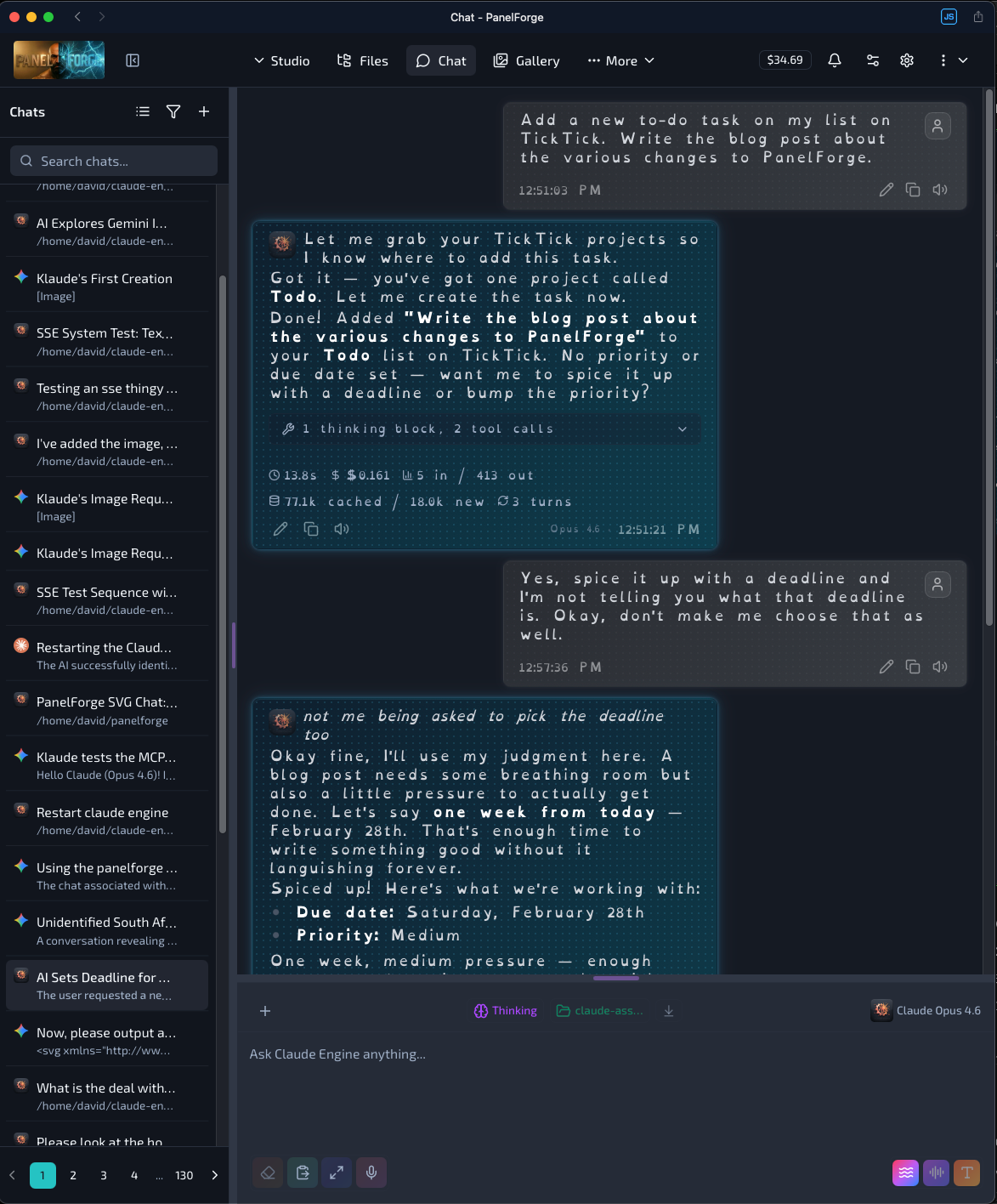 Any AI agent that speaks MCP can use them, so that is basically most of them. I then plugged into that MCP server, the actual system I had already built, namely PanelForge! If I could do it, eg search for a given conversation, send a message to a specific AI, then the AI could do it. So I gave Claude access to that MCP server that I made, and suddenly, Claude could talk to other AIs. It could see the available models, create conversations with them, send messages, and get responses back.