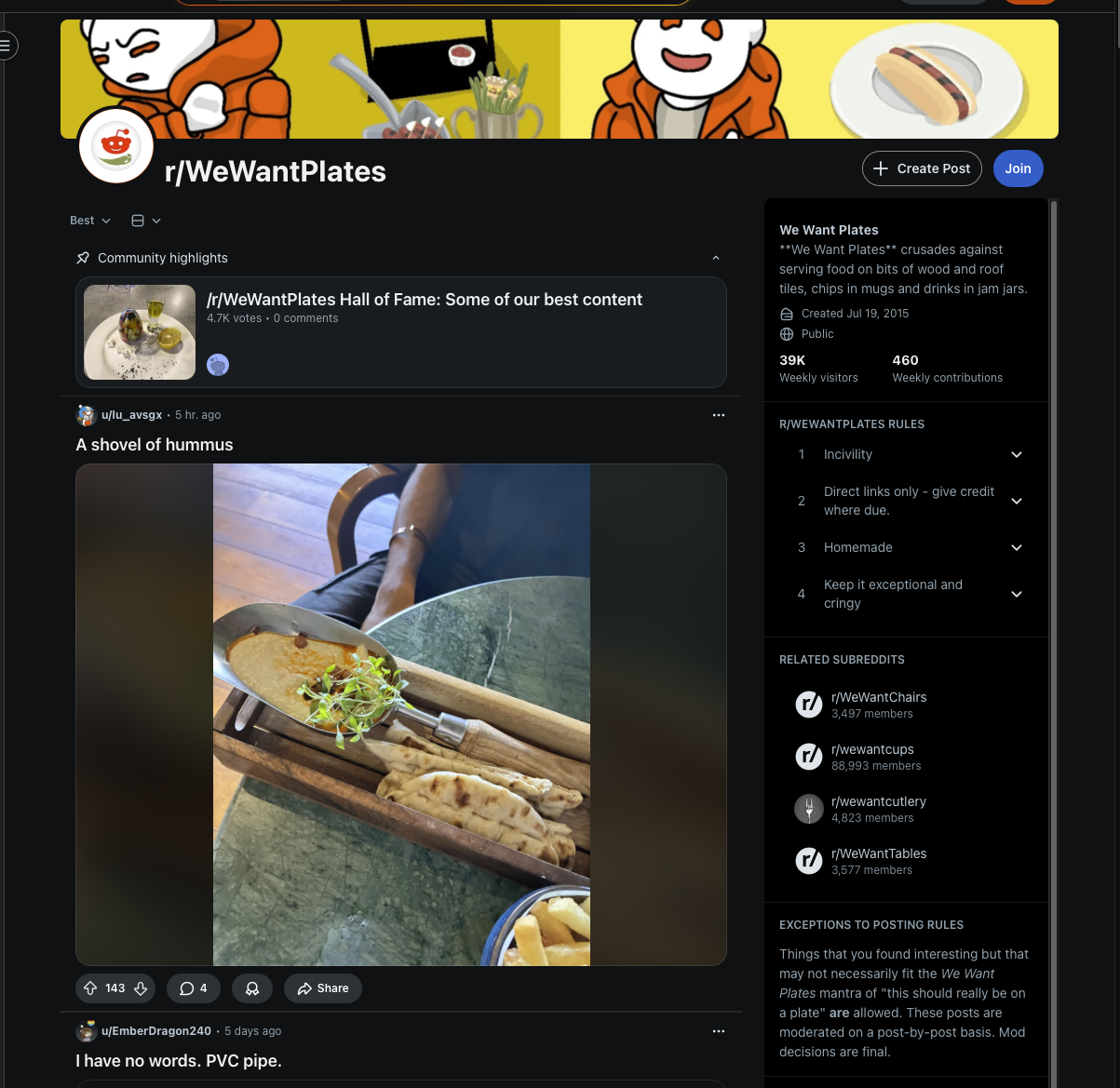 - Subreddit scan - "Scan a given sub reddit and recap the top posts of that day" - This one I actually do often to anyways, so having it find its way to me could be nice. There is one called /r/wewantplates and it's pictures of peoples food at restaurants but the restaurant in an effort to be trendy serves the food on anything but a plate, eg a frying pan, a rock, or a pot plant.